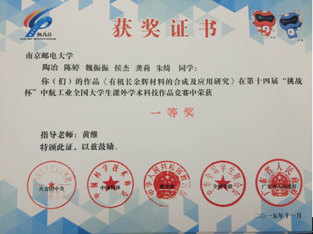 11月16日—20日,第十四届“挑战杯”全国大学生课外学术科技作品终审决赛在广州落下帷幕。由有机电子与信息显示协同创新中心主任黄维院士、中心PI陈润锋教授指导的作品《有机长余辉材料的合成及应用研究》经过激烈的角逐,最终获得全国一等奖。