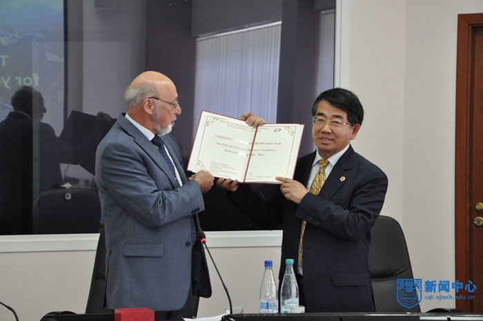 日前,应俄罗斯科学院副院长Sergey M. Aldoshin院士的邀请,我校校长黄维院士赴国立莫斯科大学和俄罗斯科学院等俄罗斯高校及科研院所进行系列巡讲。当地时间5月26日,在百余位学者的注目中,校长黄维院士获颁俄罗斯科学院名誉博士学位,并从Sergey M. Aldoshin院士手中接过学位证书。这是黄维院士继2015年7月获颁英国谢菲尔德大学名誉博士学位后,在国际学界获得的又一项重要荣誉。这不仅是对黄维院士取得的杰出学术成果的高度认可,也是对其在创新驱动发展战略下为中国科技发展做出卓越贡献的充分肯定。