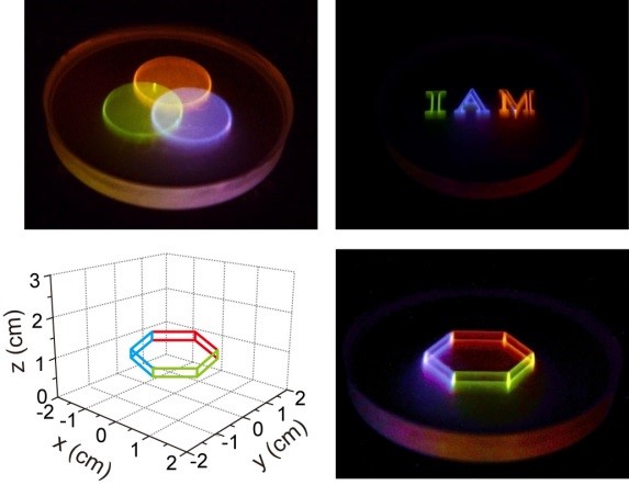 黄维院士介绍说,受限于发光材料固定波段、单一颜色发光的特点,二维彩色显示系统通常需要通过调控红、绿、蓝三种发光材料的颜色通道以及它们相互之间的叠加来得到彩色显示效果,即在显示器中,每个像素点都需要用薄膜晶体管独立控制,且每个像素点都包含红、绿、蓝三基色单元,这对工艺难度及器件稳定性都有很高的要求,也限制了显示器分辨率的进一步提高。此次开发的“全色”发光的透明纳米材料,将镧系金属离子精确掺入纳米粒子的核壳结构中,巧妙利用稀土离子间的能量传递、敏化和能量上转换技术,实现了透明无机纳米材料的“全色”发光。该纳米粒子能在不同红外激光脉冲的激发下,发出各种颜色连续可调的可见光,不需要独立的红、绿、蓝三基色,每个纳米颗粒即是一个像素点,将分辨率提高到纳米级。更为重要的是,将这些在可见光条件下透明的纳米颗粒均匀分散在三维空间中,通过肉眼不可见激光的激发和调制,可以发出多种不同颜色的可见光,从而实现真正意义上的真实立体彩色显示,并在空间三个维度都达到纳米级的极限显示分辨率,这是传统显示方法所不能企及的,为立体显示技术提供了一条革命性的思路和途径。我校陈润锋副教授深入研究和模拟了该纳米粒子内部复杂的光物理过程,发现这类材料表现出的特殊光学性质受非平衡态下的光子转移、能量传递和上转换过程等控制。相关文章被刊登在最新一期的《自然 • 纳米技术》(Nature Nanotechnology)杂志上,这也是黄维院士和陈润锋副教授领导的课题组连续在化学学科国际顶级期刊—《德国应用化学》(Angewandte Chemie-International Edition,2013年)和材料科学领域国际顶级期刊—《先进材料》(Advanced Materials,2014年)发表出色工作之后,取得的又一重大科学研究成果。