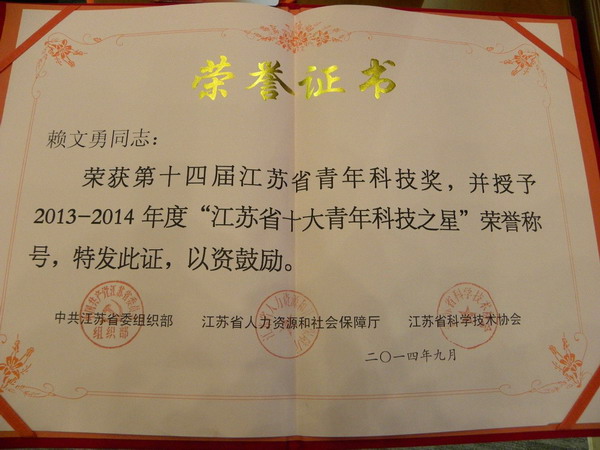 开幕式上,第十四届江苏省青年科技奖获得者、2013-2014年度“江苏省十大青年科技之星”、第十一届江苏省优秀科技工作者获得表彰。我校信息材料与纳米技术研究院赖文勇教授被授予2013—2014年度“江苏省十大青年科技之星”荣誉称号。