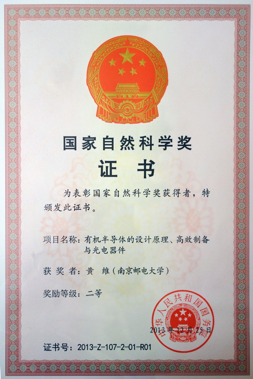 1月10日,在人民大会堂里隆重举行了2013年度国家科学技术奖励大会。由我校黄维院士团队领衔完成的“有机半导体的设计原理、高效制备与光电器件”成果获国家自然科学奖二等奖。我校作为第一完成单位获奖。这是我校在国家科技奖励三大奖层面上的历史性突破,也是目前江苏省省属高校首个国家自然科学奖。