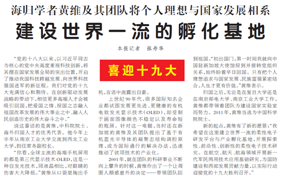 2001年,就在团队的科研事业不断向上攀升的时候,黄维作出了一个让周围人颇感意外的决定——带领团队回到祖国。“初出国门,第一时间我就向中国驻新加坡大使馆报到并接转党组织关系,始终盼着早日回国。只有把个人理想追求与国家发展、民族富强紧密结合,人生才更有价值。”黄维表示。